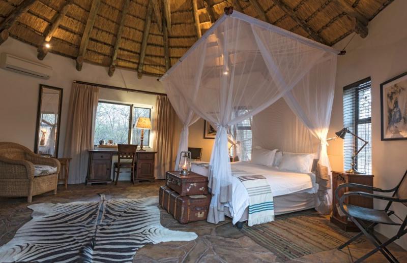 Lodge im traditionellen Stil im privaten Onguma Game Reserve im Osten des Etosha Nationalparks. Lodge/Unterkunft Onguma Forest Camp, Namibia Aktivitäten Safarifahrten Bushwanderungen
